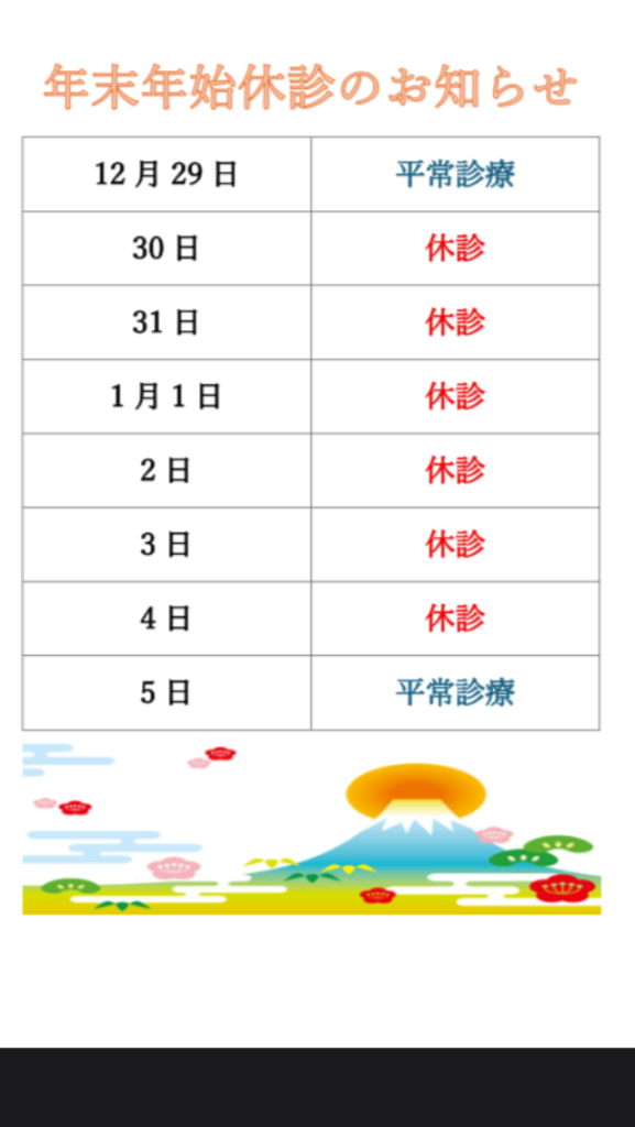 12月29日まで平常診療です。年始1月5日より平常診療となります。年末年始の自費施術予約が混み合っています。早めのご予約をおすすめします。体の不調は岡崎市矢作の中村接骨院にご相談下さい。